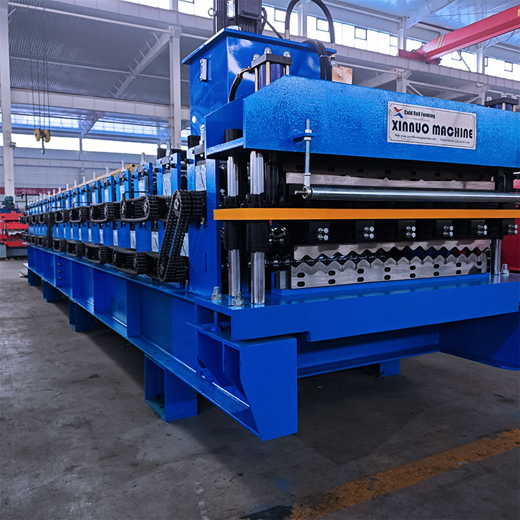 The whole working process is fully automatic, with simple operation steps: first, put the metal coil on the decoiler, adjust the tension; then, the sheet enters the leveling device to eliminate deformation; then, the feeding system sends the sheet to the double-layer forming station, and the forming rollers roll the sheet into two different profiles at the same time; after forming, the cutting system cuts the profiles according to the set length; finally, the finished products are sent to the receiving table, and the whole production process is completed. The machine can realize continuous production, and the operation can be completed by 1-2 workers, which greatly improves production efficiency.